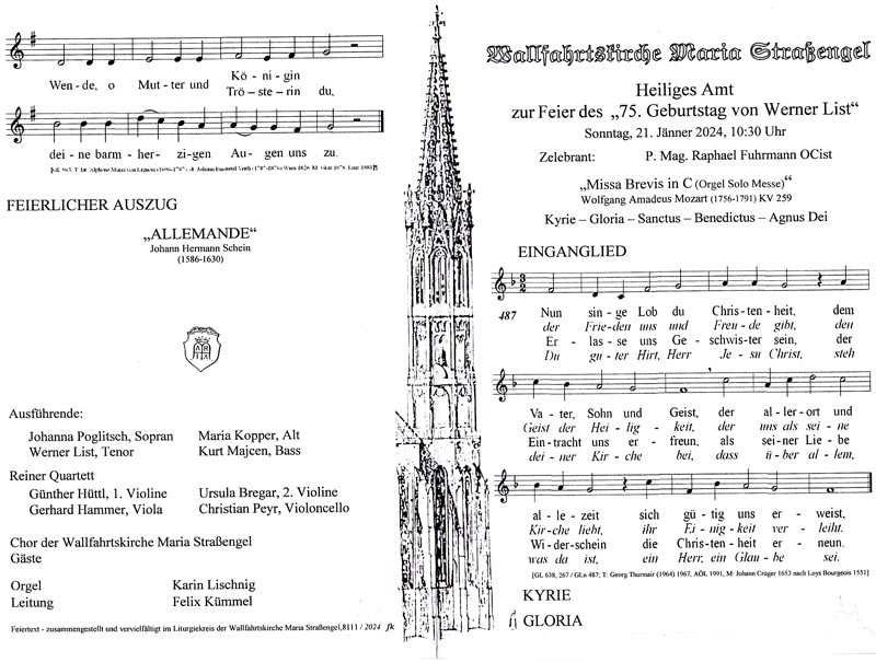 Mozart am Sonntag 21 Sonntag Jan 2024 Posted by Kurt in Messe ≈ Hinterlasse einen Kommentar W.A. Mozart (1756-1791) Missa in C (KV 259) für Soli, Chor, Orchester und Orgel Wallfahrtskirche Maria Straßengel Teilen mit: Klick, um auf Facebook zu teilen (Wird in neuem Fenster geöffnet) Facebook Klicke, um auf X zu teilen (Wird in neuem Fenster geöffnet) X Gefällt mir Wird geladen … Ähnliche Beiträge